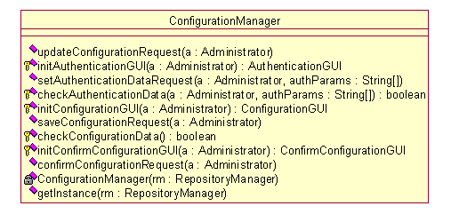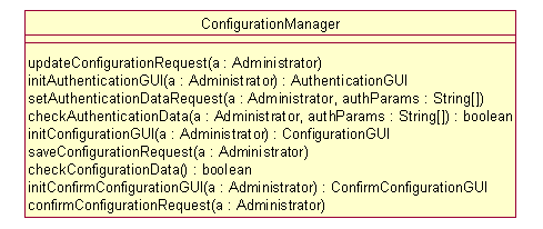 - contains ConfigurationManager class which is the controller for the Configure the System use case. It implements the lazy-loaded Singleton pattern and is responsible for authenticating the administrator, building and displaying the interface with the configuration of the system, and for saving data into repository and refreshing modified data into the system.