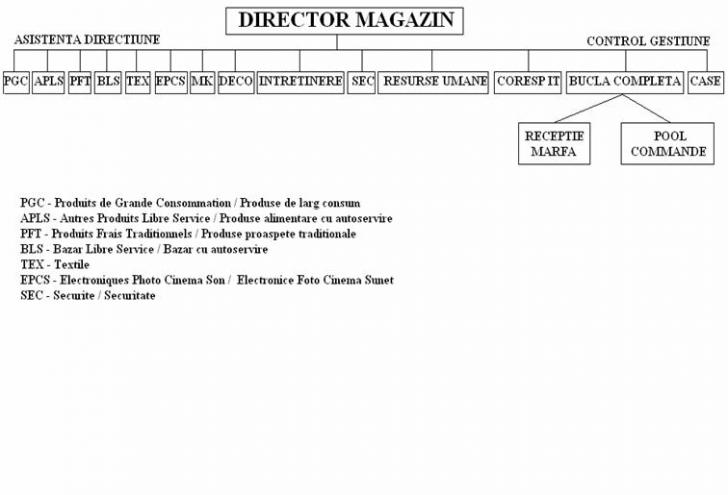 Structura organizatorica a societatii poate fi urmarita pe organigrama de mai jos. Este o structura ierarhic-liniara, care are avantajul simplitatii si al claritatii in definirea responsabilitatilor. Acest mod de imbinare a elementelor structurii organizatorice si a raporturilor existente intre compartimentele firmei sunt adoptate de toate magazinele CARREFOUR.