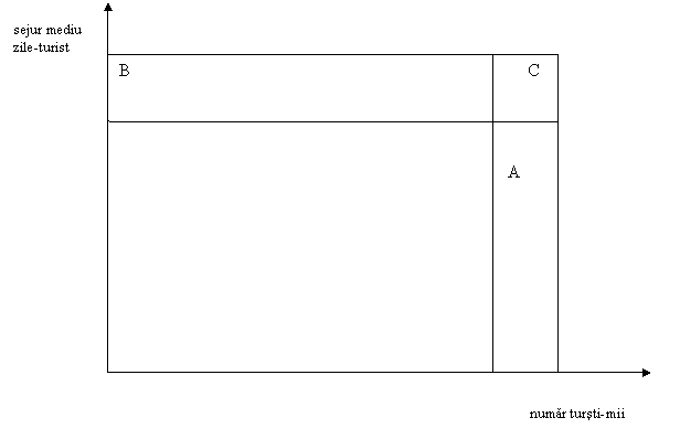 In figura se prezinta situatia unui produs turistic la care piata efectiva este 360.00 zile-turist , iar piata potentiala se ridica la 600.000 zile-turist; piata efectiva reprezinta de 60 % din dimensiunile pietei potentiale.De la nivelul sau actual produsul se poate extinde pe seama consumatorilor relativi (zona A) sau pe seama intensificarii consumului (zona B); actionandu-se pe ambele cai, pana la limitele extreme ale pietei potentiale, se poate acoperi si zona C, adica pe seama ridicarii la nivelul optim a consumului celor care in prezent fac parte inca din categoria consumatorilor relativi.