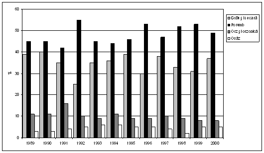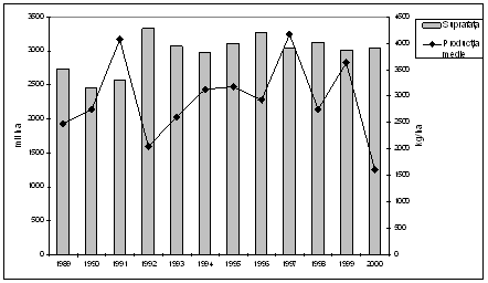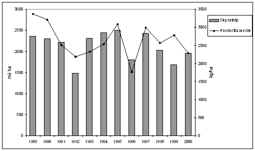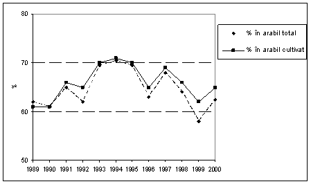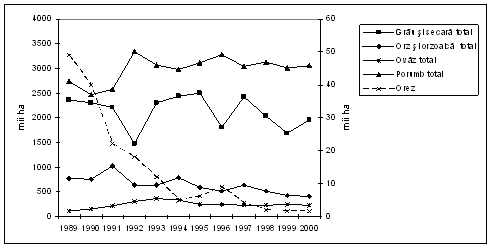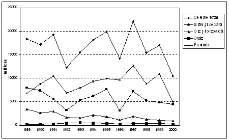 In perioada 1990 - 2000 aproximativ 65% din terenul arabil total a fost cultivat cu cereale (ajungand la 70% in anii 1993 - 1997) si peste 20% din valoarea productiei agricole a fost generat de acest sector (figura 11.1.)