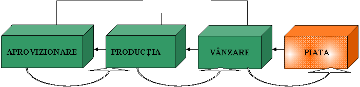 Mecanismul functional din figura de mai sus, pune in evidenta existenta indispensabile a doua circuite: a) informational, in sensul piata - productie - aprovizionare, context in care vanzarea in calitatea sa de compartiment functional pentru interesele productiei, preia informatiile din piata cumparatorilor (utilizatorilor), le analizeaza, prelucreaza si sistematizeaza, dupa anumite reguli, cerinte si conditii, transmitandu-le tuturor activitatilor din amonte;