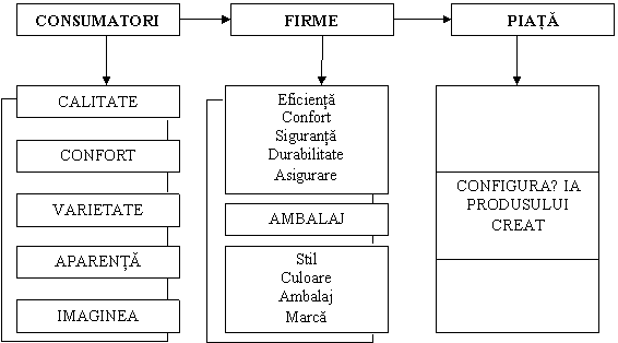 Firmele creeaza un design pentru un nou produs, pentru a veni in intampinarea unor specificatii primite din partea clientilor in ceea ce priveste calitatea, confortul, varietatea, aparenta, imaginea (coloana din stanga Figura 1). Produsul actual este creat dupa selectarea unei structuri de produs (coloana din mijloc) care determina o anumita configuratie noului produs (coloana din dreapta).
