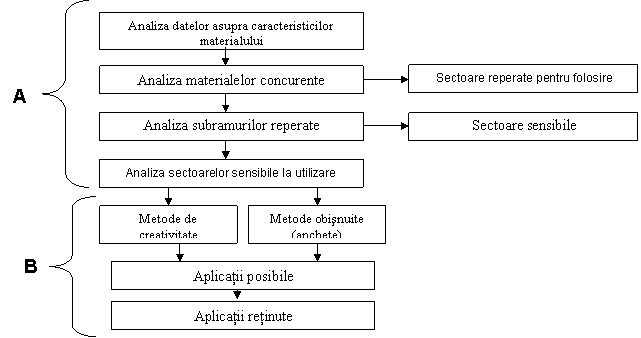 Intr-o asemenea optica au fost demarate studiile privind utilizarea tevilor de metal in transporturi, in constructii, etc. au fost insa si alte utilizari, ca de exemplu: utilizari ale acestor semifabricate la terenurile de sport. In plus, contactele stabilite (anchetele efectuate pe ramuri si sectoare) pot furniza si alte informatii, ca de exemplu, sectoarele (subramurile) capabile sa adopte noile aplicatii. In cadrul sectoarelor (subramurilor) "reperate" decizia de folosire a materialului poate aparea fie ca urmare a unei sedinte de creativitate (de tip brainstorming) in functie de natura produsului, fie a unei tratari specifice printr-o metoda de lucru practicata in cadrul firmei pentru stabilirea folosirii noului material. Informatiile obtinute prin asemenea analize sunt insa considerate ca fiind limitate, avandu-se in vedere urmatoarele considerente: