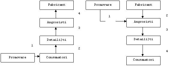 Consumatorii devin constienti de existenta produsului atunci cand aud de acesta de la vanzator. Ei pot cere produsul de la vanzator, care la randul sau il solicita de la producatori. Aceasta strategie se numeste pull strategy (strategie de tragere), deoarece produsul a fost solicitat prin canalul de distributie ca urmare a vanzarii lui. Cand producatorii isi promoveaza produsele catre angrosisti sau detailisti, eforturile lor promotionale sunt denumite push strategy (strategie de impingere). Angrosistii promoveaza produsele catre detailisti, care le promoveaza mai departe catre consumatori. Deci, produsul este impins pe canalul de distributie. Vanzarile personale sunt utilizate mai ales in utilizarea strategiei de impingere.
