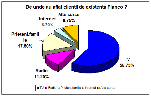 Dintre cei chestionati in procent de 58.75% au indicat televiziunea ca principala sursa de informare cu privire la existenta magazinului si a firmei Flanco.