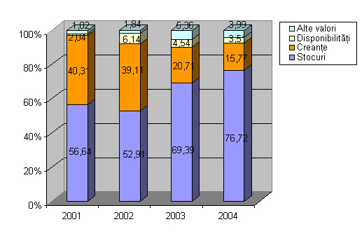 Rata activelor circulante inregistreaza o tendinta de descrestere, respectiv cu 7.58% in 2004 fata de 2001 iar rata stocurilor inregistreaza o crestere de 10,32%.