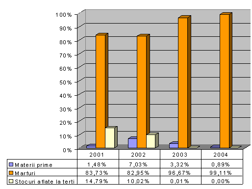 concomitent valoarea datoriilor totale a crescut in 2004 fata de 2000 cu 61,50 %. Aceasta crestere a stocurilor nu reflecta o situatie negativa datorita faptului ca firma si-a extins activitatea, au crescut investitiile si stocurile iar cea mai mare parte din datorii o reprezinta datoriile pe termen lung.