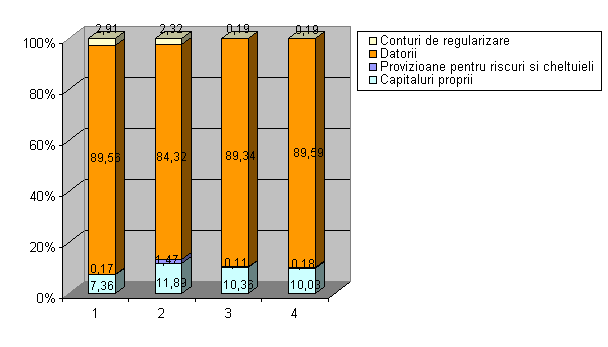 in evolutia pasivelor se observa in ansamblu o tendinta de crestere cu 58,60% in 2004 fata de 2000. Capitalurile proprii au inregistrat o crestere semnificativa ajungand in anul 2004 la 275,91%, aceasta crestere datorandu-se maririi capitalului social si cresterii profitului. De asemenea se poate observa ca firma si-a marit capitalul social, cea mai mare majorare a lui a fost in anul 2002 cand a crescut cu 685,41%.