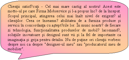 Firma Mobservice S.R.L. produce si comercializeazǎ o gamǎ largǎ de produse de mobilier unicat, la comandǎ, pentru dotarea apartamentelor, a hotelurilor, sediilor de firma, magazinelor si altor locatii. Avantajele mobilierului produs la comanda de cǎtre aceastǎ firmǎ sunt: