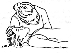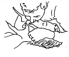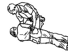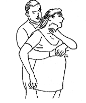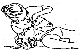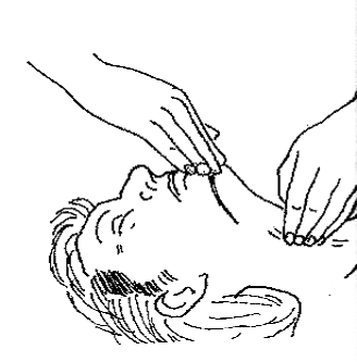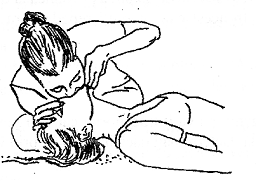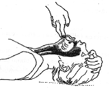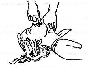 b) impingerea mandibulei fara rasturnarea capului (fig.2), daca se presupune ca exista raniri ale gatului: se pun mainile de ambele parti ale capului, imobilizand capul si gatul; se apuca barbia cu degetele 24 ale fiecarei maini, ridicand-o si impingand-o usor inainte (spre torace); folosind degetele mari, se deschide gura accidentatului.