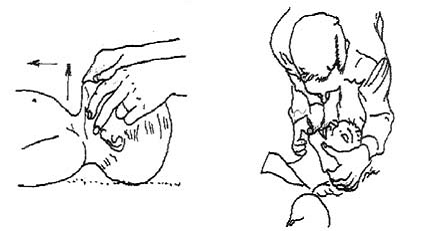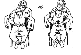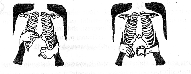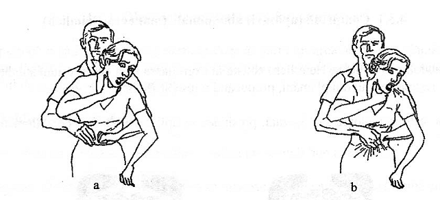 Art.27. Daca stopul respirator a fost cauzat de obstructia cailor respiratorii cu un corp strain, se executa urgent manevra Heimlich sau extragerea manuala. Dupa eliberarea cailor, se va verifica, timp de 35 secunde, existenta respiratiei: se pune urechea langa gura si nasul victimei si se privesc cu atentie miscarile susjos ale toracelui (fig.3).