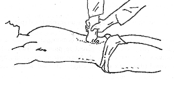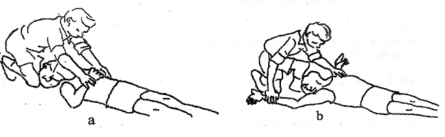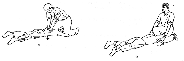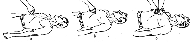 Fig.33. Compresiuni in zona inferioara a corpului. a compresiunea aortei abdominale; b compresiunea arteriala la radacina membrului inferior; c compresiunea arterei femurale. |