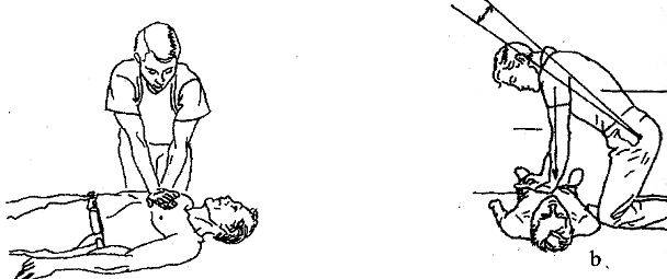 b) Daca accidentatul este inconstient si nu prezinta vatamari si leziuni care ar contraindica in mod evident miscarea si deplasarea sa (cadere cu grave leziuni si vatamari, fracturi, hemoragii), victima va fi asezata intr-o pozitie in care sa poata fi examinata culcat pe spate pe o suprafata plana si suficient de rigida, fara a fi miscat inutil, i se desfac hainele la gat, piept si zona abdominala, se verifica starea respiratiei si existenta pulsului. In cazul lipsei functiilor vitale, fara a se mai tine seama de eventuale interdictii de miscare a accidentatului, acestuia i se va face respiratie artificiala sau reanimare cardio-respiratorie.