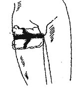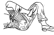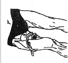 Fig.36. Hemostaza prin flexie fortata a membrelor. a hemostaza prin flexie fortata la hemoragia coapsei; b hemostaza prin flexie fortata la hemoragia gambei; c hemostaza prin flexie fortata la hemoragia antebratului. |