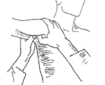 la locul unde se indoaie coapsa pe abdomen (plica inghinala), se apasa cu pumnul strans imediat deasupra zonei inghinale;