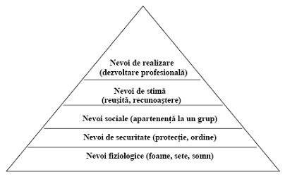 In Figura 1.2 se observa graficul acestor necesitati pe care Maslow l-a schitat sub forma unei piramide avand cele mai puternice necesitati la baza piramidei, ca "fundatie" pentru necesitatile ce apar la nivelurile superioare. Astfel, indivizii sunt motivati de nevoile de rang inferior pana in momentul in care acestea sunt satisfacute, dupa care acestea inceteaza sa mai motiveze si incepe sa se manifeste tendinta spre nevoile de rang superior. [2]