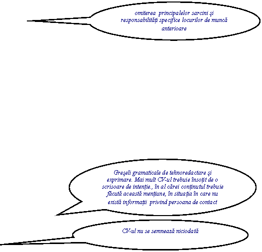 prea concentrat pe responsabilitatile avute anterior - transformarea CV-ului intr-o monotona lista a locurilor de munca anterioare si a sarcinilor pe care candidatul le-a indeplinit. Este recomandabil ca pentru fiecare loc de munca sau post ocupat de un candidat in perioada precedenta sa fie ::::::::::::???