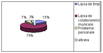 Raspunsurile de la aceasta intrebare ne indica si mai mult faptul ca exista probleme in comunicarea, colaborarea angajatilor in colectiv, respectiv intre management si angajati. Din aceste raspunsuri se vede ca angajati au timp pentru a-si realiza sarcinile in timpul acordat pentru aceasta. Iar procentajul la problemele interpersonale a angajatilor este mic, deci nu se poate zice ca exista probleme interpersonale.