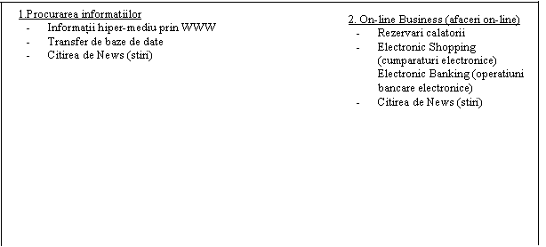 Posibilitatile de aplicare sunt deja multiple in present, paleta sa extinzandu-se de la serviciile informationale, la prestarile de servicii si pana la tele-cumparaturi. in general, accesul la Internet este interesant pentru multi utilizatori pentru ca ofera informarea si comunicarea globala.