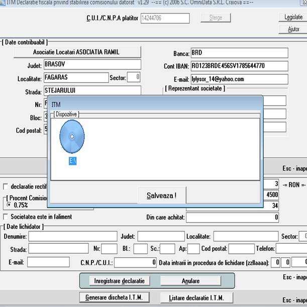 Prin selectarea optiunii << Generare discheta I.T.M. >> declaratia se salveaza pe suport magnetic.