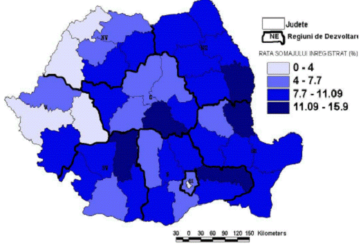 Harta somajului pe regiuni si judete sublinieazǎ faptul cǎ in vestul tarii rata somajului este mai scǎzutǎ, ca o cauzǎ a influentei capitalului strain in aceastǎ zonǎ, iar regiunile cu cea mai mare rata a somajului rǎman in continuare zonele in declin industrial, ,,cu economii ne-echilibrate, unde socul pierderii competitivitatii nu a fost preluat de un influx de capital strain sau intern satisfacator"[7].