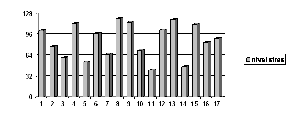 Se constata ca media nivelului de sres la nivelul organizatiei este de 87 puncte, ceea ce inseamna ca nivelul de stress este acceptabil, dar totusi unele aspecte ale muncii ar trebui imbunatatite. Totodata se remarca ca membrii: nr. 1, 6, 8, 9, 12, 13 si 15 se afla in zona nivelului de risc prea ridicat , ceea ce inseamna elaborarea unei strategii de reducere a stresului ca parte integrata a pastrarii celui mai pretios bun - forta de munca, prin includerea urmatoarelor elemente: