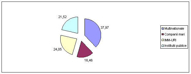 Intreprinderile mici si mijlocii reprezintǎ 24,05% din numǎrul total al companiilor la nivelul cǎrora a fost realizat studiul,institutiile publice detin o pondere de 21,52%,companiile mari 16,46%,iar companiile multinationale detin o pondere de 37,97% din totalul companiilor la nivelul cǎrora a fost realizat studiul.