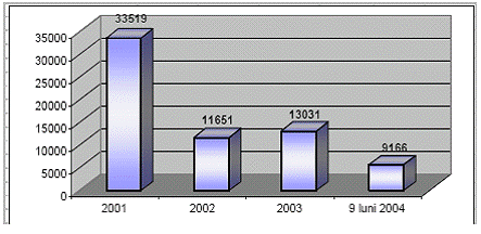 In perioada 2001-30 septembrie 2004 au fost controlati un numar de 297.059 angajatori, la care isi desfasurau activitatea 8.084.991 salariati si s-a constatat ca 19.244 angajatori foloseau 67.925 persoane fara forme legale de angajare; valoarea amenzilor aplicate este de 265.480.684 mii lei, ceea ce reprezinta 66% din totalul amenzilor aplicate in domeniul relatiilor de munca.