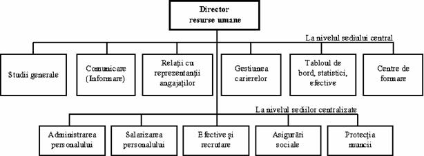 Organizarea descentralizata se desfasoara pe doua nivele. Fiecare filiala (subunitate) poseda o interfata resurse umane, care raporteaza problemele specifice conducatorului acesteia. Directia de resurse umane transmite ansamblul informatiilor si procedurilor de urmat responsabilului de resort din filiala.