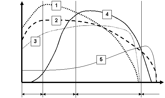 Pe de alta parte, continutul planurilor privind resursele umane depinde de etapa in care se afla firma (debutul, cresterea, atingerea performantelor maxime si declinul). Ilustrarea evolutiei indicatorilor functionali si de performanta pe care firma ii poate inregistra este prezentata in fig. 4.7.