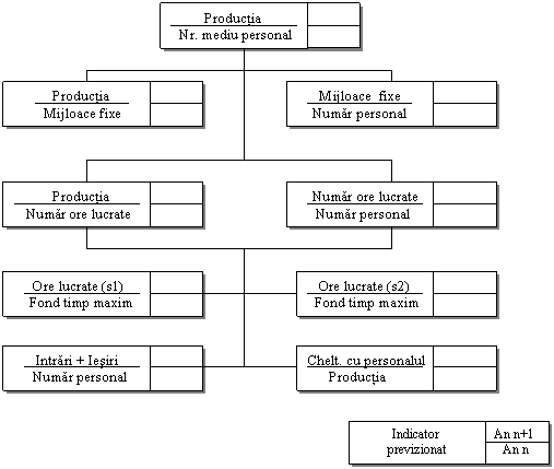 Tabloul de bord pe care il propunem are ca punct de plecare productivitatea muncii - principalul indicator sintetic care evidentiaza utilizarea resursei umane. Urmarind o abordare de tip cauza-efect, putem descompune indicatorul productivitatii muncii, determinat ca raport intre productia realizata si numarul de personal, in elemente care tin seama fie de inzestrarea tehnica a organizatiei, fie de utilizarea timpului de munca. Inzestrarea tehnica a organizatiei poate fi pusa in evidenta cu ajutorul randamentului utilizarii mijloacelor fixe (productia obtinuta la 1000 lei mijloace fixe), respectiv inzestrarea tehnica a personalului (raportul dintre mijloacele fixe si numarul de personal).