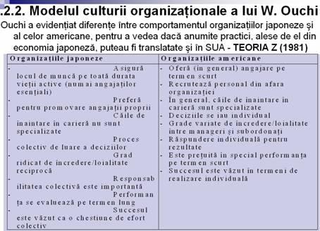 n La inceputul anilor '80 au aparut noi teorii, centrate pe conceptul de cultura organizationala. Pentru Schein [1985], cultura organizationala este "structura de conceptii de baza, pe care un grup le-a inventat, descoperit sau dezvoltat, invatand sa rezolve probleme legate de adaptarea la mediul extern sau de integrarea sa interna; structura care a functionat suficient de bine pentru a fi considerata solida si, in consecinta care necesita sa fie transmisa noilor membrii drept un mod corect de a percepe, gandi si simti tot ce are legatura cu aceste probleme."