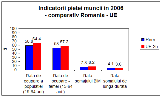 Pactul European pentru Tineret pune accent pe facilitarea accesului tinerilor pe piata muncii, combaterea somajului in randul tinerilor si cresterea calitatii actului de invatamant. Rata somajului BIM in randul tinerilor din Romania era, in 2006, de 21%. Din cele 213,3 mii persoane someri din grupa de varsta 15-24 de ani, 171,7 mii persoane erau someri care nu au lucrat niciodata. Rata somajului de lunga durata in randul tinerilor era de 14,2%, din care in mediul urban era de 18,0%, iar in mediul rural de 10,9%.