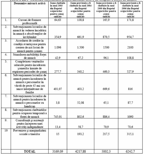 In Romania, in perioada de tranzitie, raportul dintre politicile active si cele pasive nu a fost constant. Dacǎ in primii ani dupǎ revolutie a existat o incercare de sporire a ponderii cheltuielilor pentru mǎsurile active, dupa `97 locul acestora a fost luat de politicile pasive, ca urmare a proceselor de restructurare si a necesitǎtii protectiei salariatilor in urma concedierilor colective.