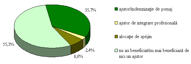 Ajutorul financiar se acordǎ celor care isi pierd locul de muncǎ sub forma unei indemnizatii sau beneficiu de somaj si este conditionat de durata si nivelul cotizatiei. Pentru cei care nu au avut un loc de muncǎ sau nu au avut posibilitatea de a cotiza, statul oferǎ o alocatie financiarǎ, stabilitǎ in raport cu salariul mediu/ minim pe economie, dacǎ dovedesc cǎ veniturile lor nu depǎsesc un anumit nivel specificat in lege (Legea 76/2002 privind sistemul asigurǎrilor pentru somaj si stimularea ocupǎrii fortei de muncǎ).