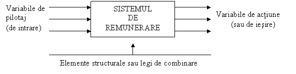 O simpla, dar interesanta reprezentare a sistemului de remunerare este redata in figura nr. IX.1, care utilizeaza modelul cibernetic pentru a surprinde atat structura sa interna, cat si relatiile sale cu mediul economic si social. Ca orice sistem cibernetic, sistemul de remunerare poate fi considerat o veritabila "cutie neagra", care transforma variabilele de intrare (sau de pilotaj), in variabile de iesire (sau de actiune).