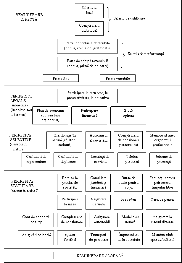Perifericele legale. In cea mai mare parte a tarilor europene cu economie de piata dezvoltata aceste elemente ale remunerarii au facut obiectul unor acte legislative. Exprimate de cele mai multe ori in termeni monetari si implicand un varsamant in bani la sfarsitul unei perioade de referinta (gratificatii) sau dupa un timp de blocaj (de obicei cinci ani), aceste periferice completeaza remuneratia fara a avea caracterul legal al unui salariu. Perifericele legale sunt de regula de natura colectiva, exceptia constituind-o elementul "stock options", care deschide o anumita plaja de flexibilitate individuala. Elementele incluse la aceasta pozitie se bucura de un regim fiscal particular, in sensul ca pot fi exceptate in totalitate sau in parte de la calculul cheltuielilor sociale. Caracteristicile acestor periferice recomanda utilizarea lor ca instrumente complementare in cadrul politicii de remunerare.
