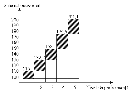 Din acest grafic rezulta ca raportul intre remunerarea performantei si cea a postului este 0,15, iar nivelele de performanta sunt 5. Salariul de baza al unei gradatii (categorii) pe post este egal cu salariul maxim ce se poate obtine pe postul inferior.