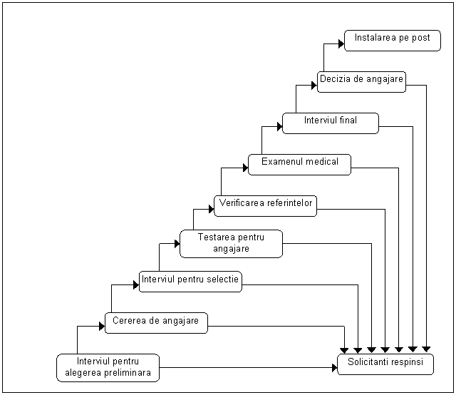 Potrivit teoriei si practicii manageriale in domeniul resurselor umane, procesul de selectie a personalului se desfasoara in mai multe etape (Fig. 1) ca, de exemplu:
