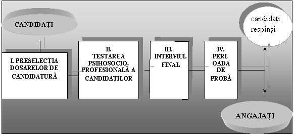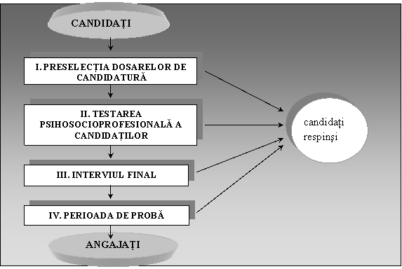 a) testele psihosociologice, cu ajutorul carora se poate realiza o evaluare a personalitatii candidatului, a intereselor si motivatiilor acestuia. In acceptiunea sa cea mai larga[4], termenul "personalitate" defineste "fiinta umana considerata in existenta ei sociala si avand o inzestrare culturala specifica". Personalitatea integreaza in sine - ca sistem - organismul individual, structurile psihice umane si, totodata, relatiile sociale in care omul este angrenat, precum si mijloacele culturale de care dispune. Factorii personalitatii au fost studiati de specialisti in scopul delimitarii si precizarii componentei si caracteristicilor lor. Astfel, s-a evidentiat, in primul rand, ca acestia sunt "formatiuni integrate si integratoare sintetice", in sensul ca reunesc sau condenseaza diferite functii si procese psihice. Spre exemplu, dispozitia spre comunicare implica nu numai limbajul, ci si motivatia, dorinta de a comunica si, totodata, modul de a gandi si de a simti al candidatului. In al doilea rand, factorii de personalitate dispun de o relativa stabilitate, se manifesta constant in conduita, neputand fi radical modificati de situatii tranzitorii si accidentale. Spre exemplu, individul inzestrat cu rabdare, cu stapanire de sine si calm dovedeste aceste calitati de cele mai multe ori si abdica de la ele in mod exceptional. In cel de-al treilea rand, trasaturile de personalitate tind spre generalitate si il caracterizeaza pe om in ansamblul sau si nu numai intr-un anumit raport concret. Exemplificam inteligenta generala, modalitatea temperamentala, fermitatea in atitudini etc., care se manifesta in cele mai diverse situatii si independent de acestea. Se releva, in al patrulea rand, ca factorii de personalitate dispun de o oarecare "plasticitate", nefiind total rigizi, putandu-se restructura si perfectiona sub presiunea conditiilor de mediu. Astfel, spre exemplu, mentalitatea conservatoare cedeaza in fata fortei transformarilor revolutionare. In fine, factorii dominanti in sistemul de personalitate al fiecarui individ sunt caracteristici si/sau definitorii pentru acesta, exprimandu-l in ceea ce are esential (ca om linistit sau turbulent, talentat sau incapabil, respectuos sau insolent etc.).