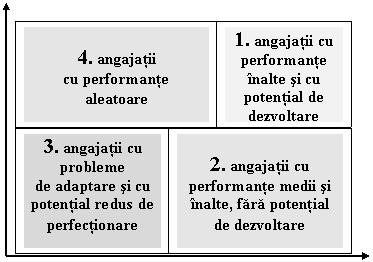 In strategia privind resursele umane, un loc important il detine evaluarea structurii si potentialului acestui fond strategic. In general, pot fi identificate 4 segmente de personal: angajatii cu performante inalte si cu potential de dezvoltare, angajatii cu performante medii si inalte, fara potential de dezvoltare, angajatii cu performante aleatoare si angajatii cu probleme de adaptare si cu potential redus de perfectionare (fig. 4.2, adaptare dupa