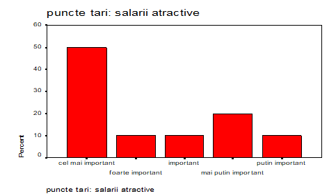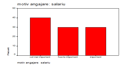 Salariul ca motiv al angajarii apare la toti cei chestionati ca fiind cel putin important. Astfel pentru 40% dintre respondenti este cel mai important motiv, pentru înca 60% dintre acestia este foarte important si important.