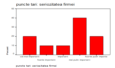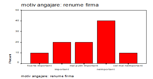 Renumele firmei a fost considerat neimportant ca si criteriu în adoptarea deciziei de angajare de catre 40% dintre respondenti, numai 10% considerandu-l foarte important, 40% dintre respondenti considerând renumele companiei important si mai putin important. Iar cei care acorda un grad scazut de importanta sunt 10% dintre cei supusi interviului.