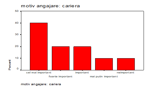 Cariera este privita ca fiind cel mai important motiv al angajarii de catre 40% dintre respondenti, iar 40% dintre acestia îl considera foarte important si important. Obiectivul carierei a fost mai putin urmarit la angajare doar de catre 20% dintre respondenti. Acest lucru poate avea drept cauza o emancipare a fortei de munca timisorene si o reorientare a acesteia (mai ales a tinerilor absolventi) catre o împlinire pe plan profesional