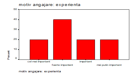 Experienta care urmeaza a fi obtinuta la locul de munca a reprezentat principalul motiv al angajarii a 60% dintre cei chestionati ca fiind foarte important si cel mai important motiv de angajare, asa cum pentru 40% dintre respondenti acesta a fost un factor nesemnificativ.