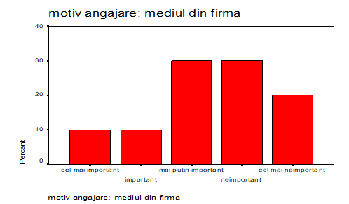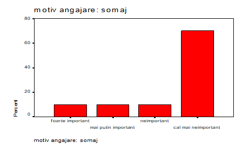 Somajul, mai exact iesirea din somaj, a constituit un motiv de angajare pentru 10 % dintre respondenti iar 20% considera ca motivul angajarii a fost mai putin important/neimportant. Pentru ceilalti 70% nefiind un posibil motiv. Astfel se deduce ca angajatii au venit de la un loc de munca stabil, sau avand o situatie materiala fara prea multe griji.