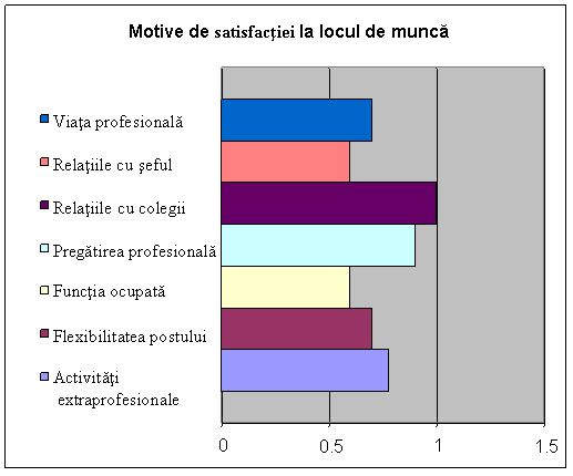 În conditiile în care 0 semnifica motiv de insatisfactie si 1 satisfactie, se observa ca principalul motiv de satisfactie profesionala a angajatilor Solectron este reprezentat de relatiile cu colegii, urmat imediat de pregatirea profesionala pe care firma o asigura pentru angajatii sai. La polul opus se regasesc, desi cu valori destul de mari, activitatile extraprofesionale, viata profesionala si flexibilitatea postului. Cu scoruri medii apar funtia ocupata si relatiile cu seful.