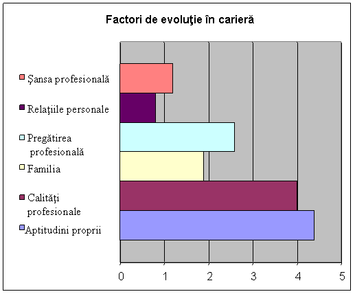 Astfel cele mai apreciate din acest punct de vedere sunt aptitudinile personale, urmate imediat de calitatile profesionale. Pe ultimul loc se afla relatiile personale si sansa. Aceste rezultate denota o maturizare a angajatului care constientizeaza faptul ca « norocul si-l face fiecare » si ca trebuie trebuie sa munceasca pentru a reusi, a trecut vremea realtiilor care asigurau o evolutie profesionala.
