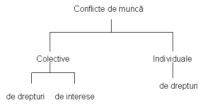 Dezacordurile intervenite intre partenerii sociali, in raporturile de munca pot provoca conflicte de munca. Conflictele de munca pot fi conflicte colective (atunci cand implica un numar mai mare de salariati, care urmaresc sustinerea acelorasi drepturi sau interese) si conflicte individuale (atunci cand implica raportul dintre angajator si un anumit salariat). Legea nr. 168/1999 privind solutionarea conflictelor de munca (publicata in MO nr. 582/29.11.1999), valabila si azi precum si Codul muncii (art. 248 alin. (2) si (3) fac distinctie intre conflictele colective de munca din faza precontractuala de negociere (care se solutioneaza prin conciliere, mediere, arbitraj sau greva) si conflictele in faza de executare a unui contract colectiv sau individual de munca (care se solutioneaza de catre instanta de judecata). (Fig.6.2.)