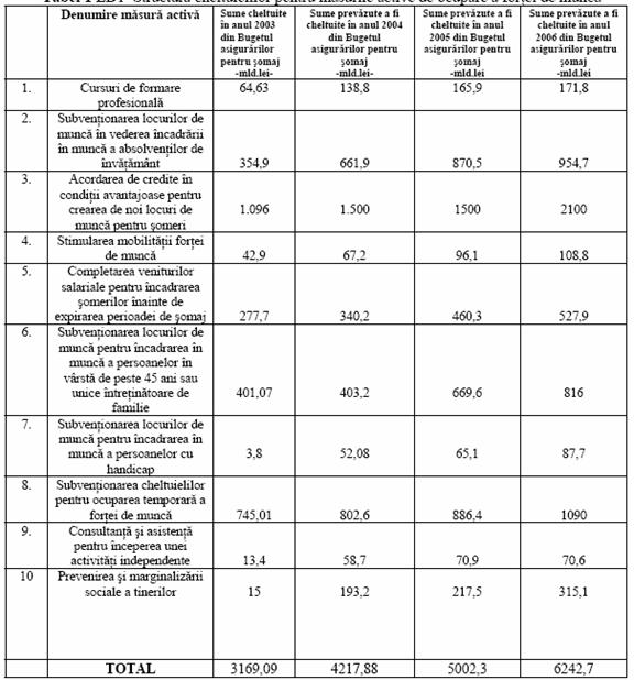 Un indicator al politicilor active ale pietei muncii este structura cheltuielilor pentru mǎsurile active de ocuparea a fortei de muncǎ, asa cum reiese din tabelul de mai jos.